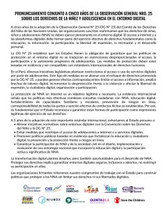 Pronunciamiento conjunto a cinco años de la Observación General Nro. 25 sobre los derechos de la niñez y adolescencia en el entorno digital LEER MAS » marzo 25, 2026